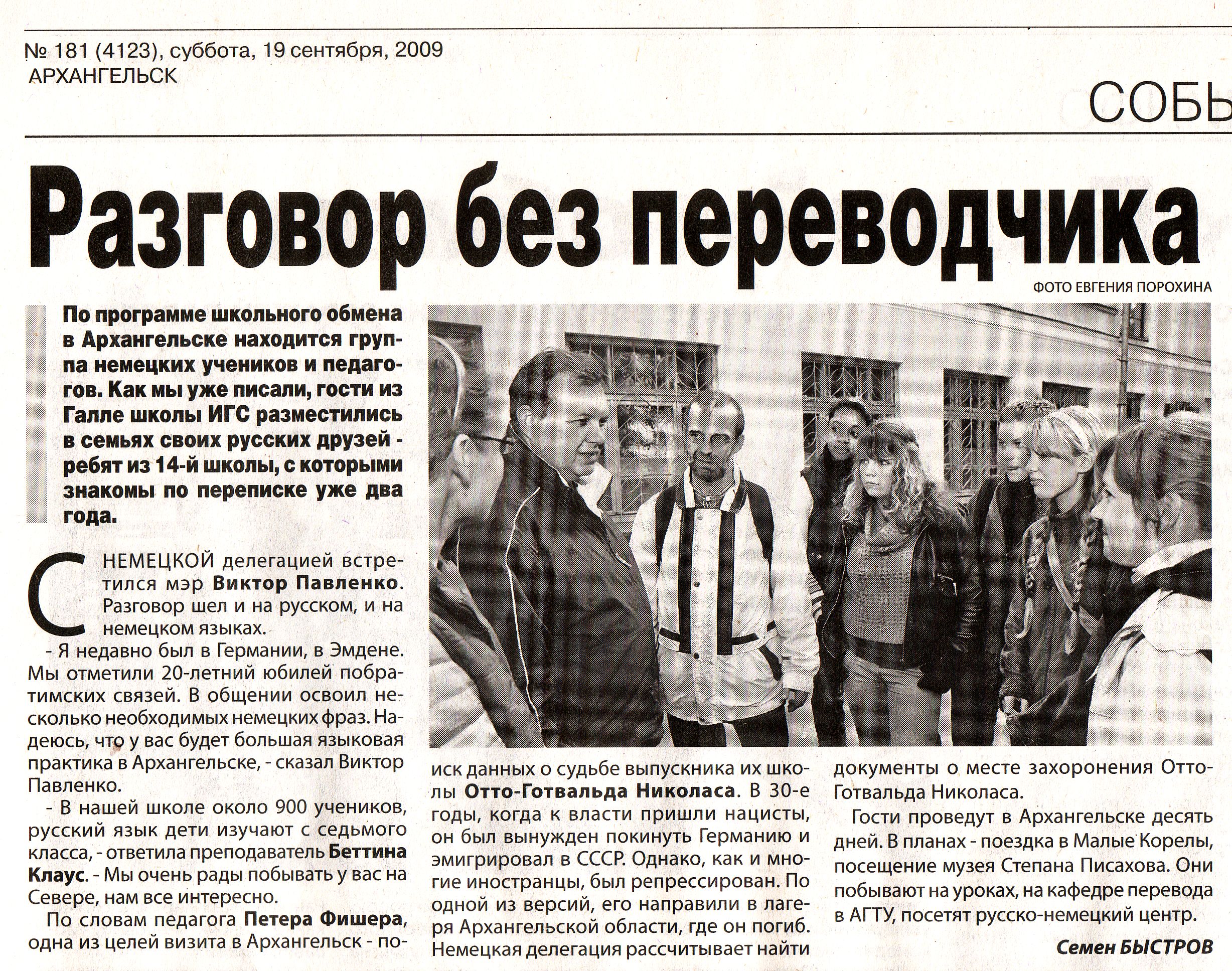 INHALTLICHE WIEDERGABE DES ZEITUNGSARTIKELS "GESPRÄCH OHNE ÜBERSETZER" IN DER ZEITUNG VOM 18.09.09 (ARCHANGELSK)
