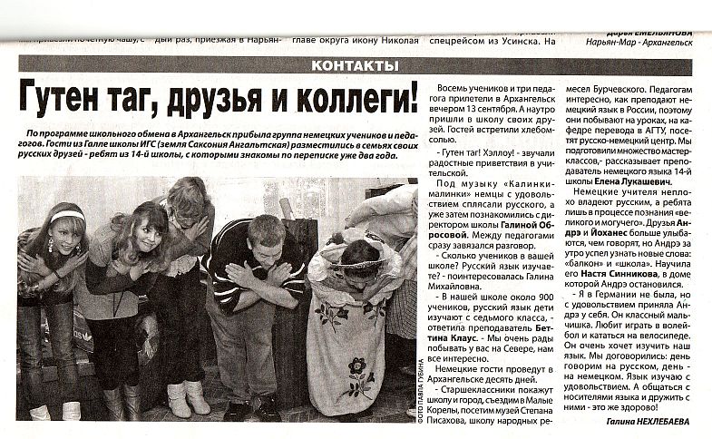 Nach dem Schulaustauschprogramm kam eine Gruppe deutscher Schüler und Pädagogen nach Archangelsk. Sie kamen aus der IGS.Halle (Integrierte Gesamtschule.Halle) und wurden bei russischen Gastfamilien untergebracht, mit denen sie seit ca. 2 Jahren im Briefkontakt stehen.