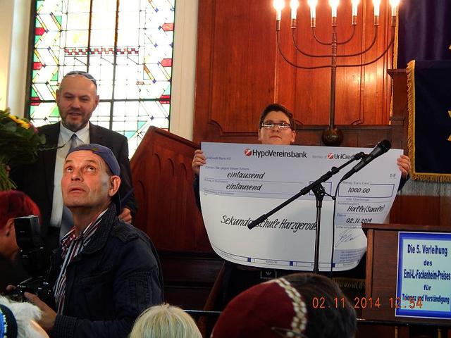 In diesem Jahr wurde der Preis an zwei Schulen Sachsen-Anhalts verliehen, die Schulprojekte in Verbindung mit jüdischen Friedhöfen realisierten. Dies sind das Philanthropinum Dessau ("Gedenkstätte in Wörlitz am Jüdischen Friedhof, Geschichte und Übersetzung der Grabsteine") und die Sekundarschule Harzgerode ("Verwandlung der Gedenkstätte des Jüdischen Friedhofs in Harzgerode"). Ein Religionslehrer a.D. aus Dessau und der Orstbürgermeister von Harzgerode erläuterten die Projekte, die - kurz gesagt- darin bestanden, an der Stelle eines nicht mehr existierenden jüdischen Friedhofes noch auffindbare Grabsteine wieder würdevoll aufzustellen bzw. den durch Vandalismus zerstörten Gedenkstein auf einem anderen jüdischen Friedhof wieder herzurichten. Die beteiligten Schüler recherchierten jüdische Familiengeschichten, die mit der Regionalgeschichte eng verwoben sind.