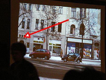 2+3 Frau Ingeborg v. Lips zeigt die benachbarten Wohnhäuser von Kurt Bauchwitz und Edgar Hilsenrath (links die Bernburger Str. 29, ehemalige Wohnstätte von Kurt Bauchwitz, I. Etage)