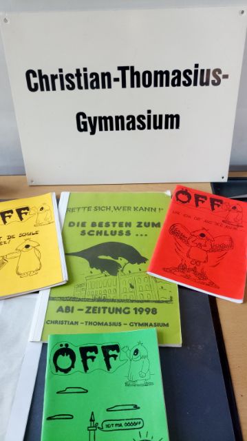 ... trafen sich am 1. September 2018 Schüler des letzten Abiturjahrgangs des Christian-Thomasius-Gymnasiums in Halle und besuchten dabei auch ihre ehemalige Schule. Als Mitbringsel übergaben sie dabei dem historischen Schularchiv der IGS zwei Schüler- und die Abizeitung. Besonders wollen wir uns aber bei den Ehemaligen dafür bedanken, dass sie das alte Schulschild vom Christian-Thomasius-Gymnasium in den Fundus des Archivs übergaben.