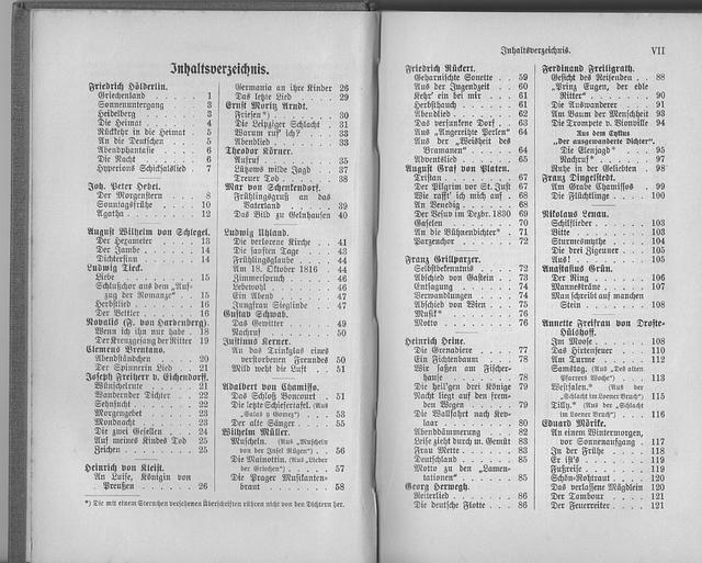 Gedichte welcher Autoren wurden nun von den beiden Herausgebern, Lehrern des Stadtgymnasiums, herausgesucht? Wir finden im Inhaltsverzeichnis Hölderlin, Hebel, Schlegel, Tieck, Novalis, Brentano, Eichendorff, Kleist, Arndt, Uhland, Chamisso, Grillpartzer, Heine, Herwegh, Freiligrath, Droste-Hülshoff, Mörike, Hebbel, Keller, Storm, Fontane, Nietzsche und heute weniger bekannte Namen.