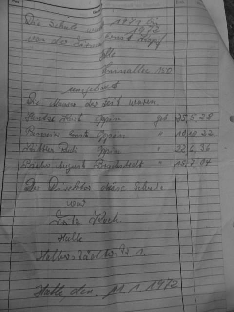 "Die Schule wurde 1971 bis1972 von der Firma Ernst Kopf, Halle, Leninallee 150 umgebaut. Die Maurer der Zeit waren