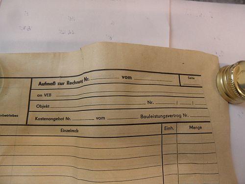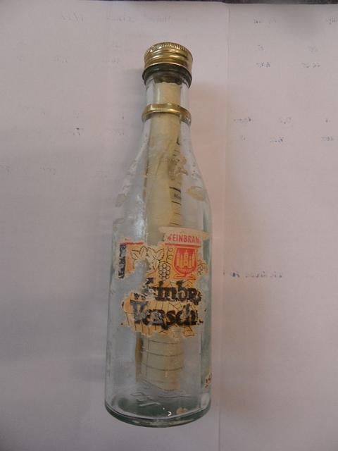 Der Inhalt der Flasche besteht aus zwei Blättern (Rechnungen aus DDR-Zeiten). Auf dem inneren Blatt findet sich folgender Text: