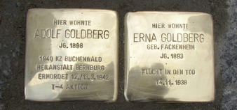 *) Am Hansering 17 (Parkplatz der Sparkasse) wohnten Adolf und Erna Goldberg (geb. Fackenheim; Schwester von Julius F.) - hier wurden Stolpersteine für die Goldbergs gesetzt