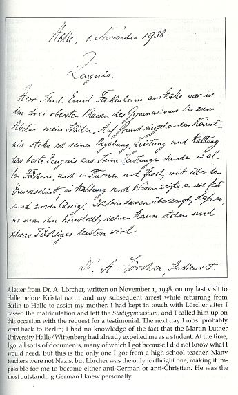 Lörchger's war on Nazism was no one-time affair but was waged every single week, in religion class. In Germany religion was taught in school, and in Halle this meant Lutheranism. Jews and Catholics were exempt, and my class had one Catholic. The two of us usually stayed away, but when Lörcher taught, I attended voluntarily, for his teaching of Christianity was inseparable from war on Nazism, and he also invoked German patriotism. In years to come I had much cause to become anti-German as well as anti-Christian. But just by himself Adolph Lörcher made both impossible.