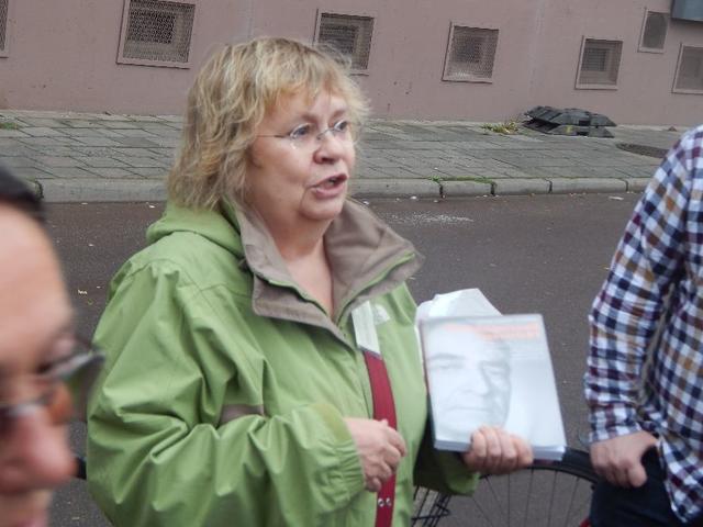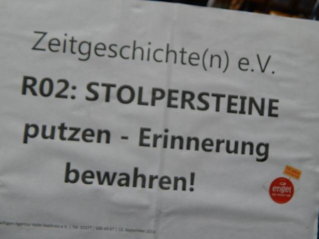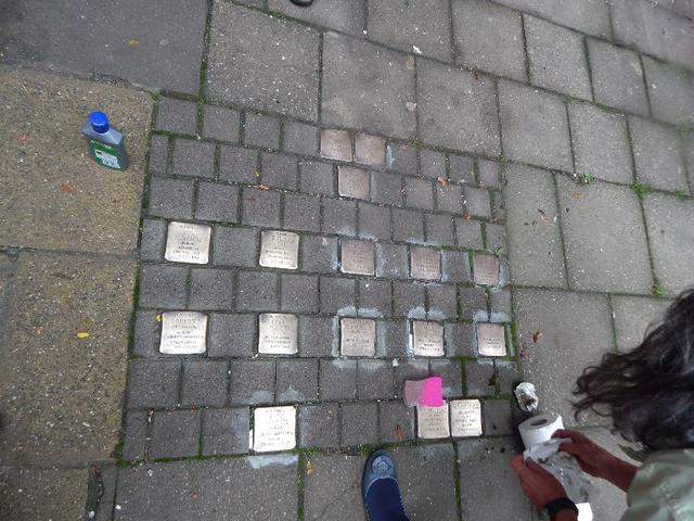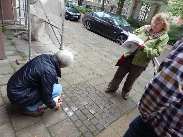 Die Gruppe "Stolpersteine" ging in Richtung Jerusameler Platz. Frau Bohley berichtete über die jüngste Publikation des Vereins und am Jerusalemer Platz/Großer Berlin wurden die ersten Steine geputzt. Danach übernahmen kleinere Gruppen den Bereich von einigen Straßen, um dort Stolpersteine zu reinigen. Frau Bohley kündigte das nächste Setzen von Stolpersteinen für den 11. Oktober an.