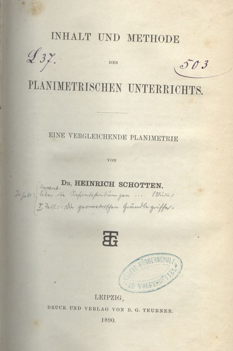 1906 | Das Buch „Anleitung zum mathematischen Unterricht an höheren Schulen“ von Dr. Fr. Reidt (Hamm) erscheint in 2.Auflage bei der Grotheschen Verlagsbuchhandlung Berlin, revidiert und mit Anmerkungen versehen von Dr. H. Schotten |