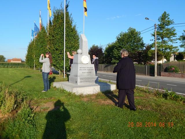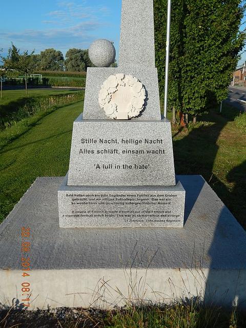 Heutige Situation: Im Dörfchen Mesen bei Ypern (flämisch "Iper") befindet sich die Jugendbegegnungstätte "Peace Village" mit einem Sportplatz und einem ungewöhnlichen Denkmal. Auf dem Denkmal findet man einen Fußball dargestellt und den deutschen Text "Stille Nacht, heilige Nacht". Dieses Denkmal wurde im Juni 2014 fertiggestellt und soll am 6. Dezember (100 Jahre nach dem "Weihnachtsfrieden") offiziell eingeweiht werden. Das Denkmal entworfen und die Aufstellung koordiniert wurde es im Rahmen eines Projekts zwischen einer 9. Klasse des Theordorianums (Gymnasium) in Paderborn und der Partnerschule Mildenhall bei Cambridge in England. Denkmäler zum Thema "Weihnachtsfrieden (engl. Christmas Truce)" gibt es an der damaligen Frontlinie mehrere. Aber eines, das von Schülern entworfen wurde, wohl nicht. Im Januar 2013 startete das Schulprojekt, im Dezember 2013 trafen sich die beteiligten Schüler beider Schulen im "Peace Village" in Mesen. Eine Steinmetzwerkstatt in Cambridge fertigte das Denkmal an, das im Juni 2014 aufgestellt wurde (s. hier). Die hier veröffentlichten Fotos vom Denkmal stammen vom August 2014, als drei Lehrer der IGS auf einer Weiterbildungsfahrt im "Peace Village" übernachteten.