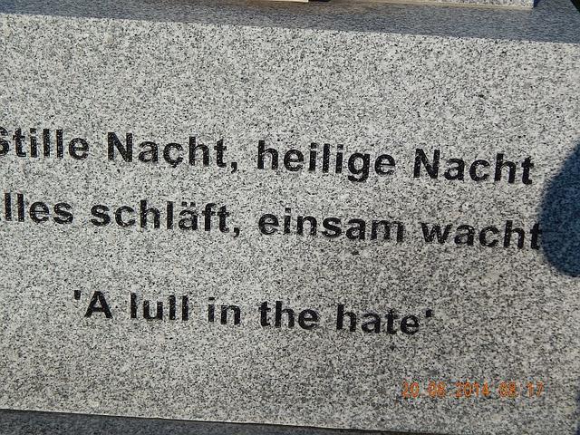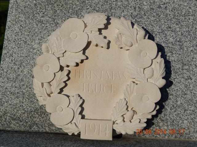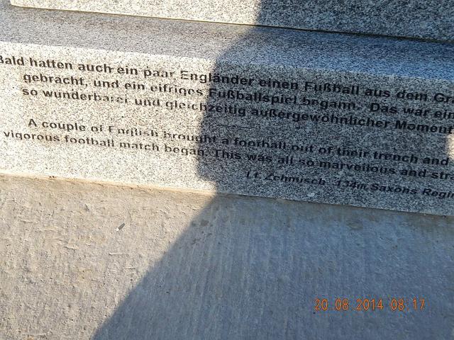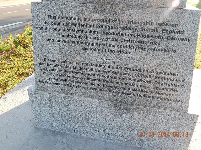 "Dieses Denkmal ist entstanden aus der Freundschaft zwischen den Schülern des Mildenhall College Academy, Suffolk, England und den Schülern des Gymnasiums Theodorianum Paderborn, Deutschland. Die Geschichte des Weihnachtsfriedens inmitten der Tragödie des Ersten Weltkrieges hat sie so bewegt, dass sie diesen Moment des Friedens im Krieg ihre Bewunderung in diesem Denkmal ausdrücken."