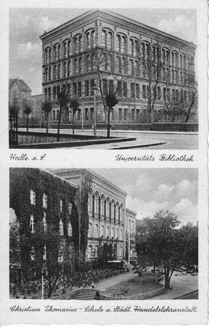 Herr Pollandt hat uns zwei weitere alte Postkarten mit der Abbildung unseres Schulgebäudes zur Verfügung gestellt, die wir mit seiner freundlichen Genehmigung hier veröffentlichen. Zu beachten ist beim Bild 4, dass die Aufnahme nach 1937 entstanden sein muss, da das Stadtgymnasium hier schon den Namen "Christian-Thomasius-Schule" trägt.