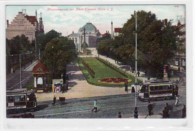 Historische Postkarten geben auch einen Einblick in das Aussehen von Straßen, Plätzen und Gebäuden in der näheren Schulumgebung. Das Foto 3 zeigt die kaiserliche Hauptpost um 1899, wo die oben beschriebene Postkarte unseres Schulgebäudes wahrscheinlich 1903 aufgegeben wurde. Am heutigen Curie-Platz befindet sich immer noch eine Post. Der Blick von der Post in Richtung Oper (früher Stadttheater) zeigt die historische Alte Promenade um 1908 - Foto 4.