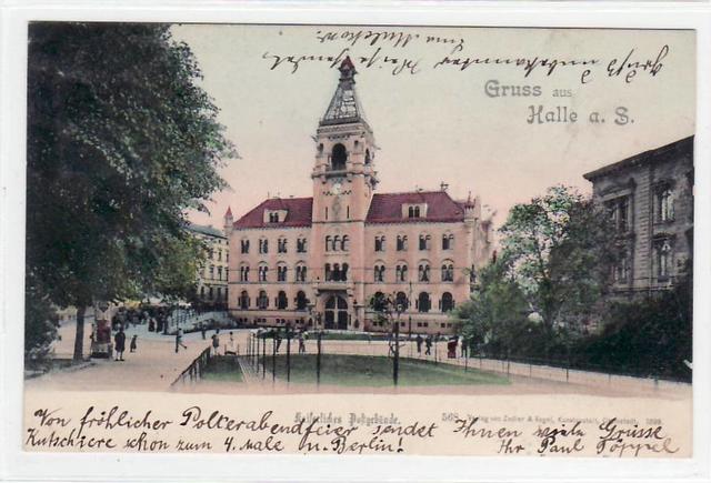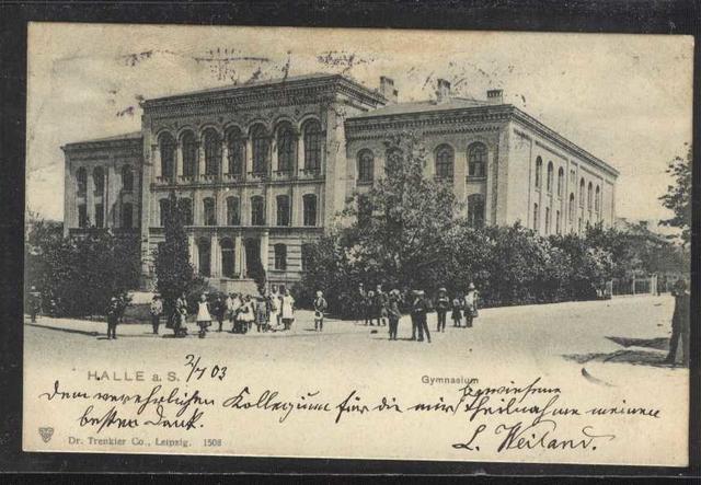 Für das historische Archiv wurde eine Originalpostkarte aus dem Jahre 1903 mit einer Ansicht unseres Schulgebäudes erworben (Foto 1 und 2). Vor dem Gebäude sieht man Schüler und Schülerinnen stehen. Die Jungen haben Mützen auf, die wahrscheinlich die Schulmützen des Stadtgymnasiums waren.