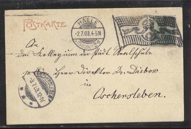 Die Karte wurde am 2. Juli 1903 in Halle abgeschickt und trägt den Eingangsstempel von Oschersleben vom 3. Juli 1903 (Laufzeit nur 1 Tag!).