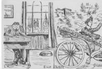rechts in der Mitte: ein Abiturient im Wagen verlässt freudig die Schule; die Schulzeit ist geschafft (das Band mit der lat. Aufschrift "fini curarum" könnte "Ende der Sorgen" heißen).
