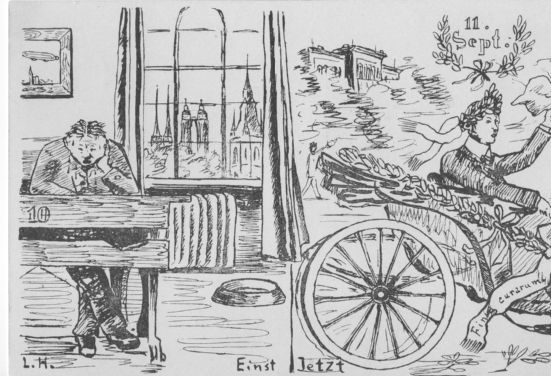 Die Gegenüberstellung der beiden Darstellungen links und rechts, gekennzeichnet mit "einst" und "jetzt" kann als Vergleich von Lebenssituationen verstanden werden (der arme gestresste büffelnde Schüler und der freudige gekränzte Abiturient).