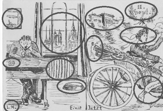 Frau H. Köstlin, deren männliche Vorfahren Schüler des Stadtgymnasiums waren, war so freundlich, uns unlängst eine alte Postkarte aus dem Dokumentenbestand ihrer Vorfahren zu schicken, auf der eindeutig unser Schulhaus zu erkennen ist. Die Postkarte ist unbeschrieben und ohne Zeitangabe versehen, wenn man von der Angabe "11. Sept." im Ehrenkranz absieht. Wie ist der Inhalt zu deuten?