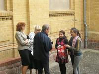 Zur feierlichen Einweihung des Gottfried-Riehm-Brunnens aus Anlass des 140-jährigen Bestehens des Schulgebäudes hatten wir auch 6 Bürger Russlands zu Gast, die in ihrer Kinderzeit die damalige sowjetische Garnisonsschule in unserem Gebäude besuchten. Sie überbrachten uns als Geschenk eine in Moskau gegossene Glocke mit einem Gruss der Schüler der ehemaligen Mittelschule Nr. 5/55 an die IGS.Halle. Wir hoffen, dass wir nach der Sanierung des Gebäudes einen entsprechenden Platz finden, an dem sie aufgehangen werden kann. Die ehemaligen Schüler der Mittelschule 5/55 in Halle haben ein Forum im Netz, auf dem die 6 Gäste zu unserer Feier über den Aufenthalt in Halle berichteteten. (Hier geht es zu den entsprechenden Seiten des Forums)