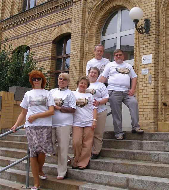 Bemerkenswert ist folgender Fakt: An unserer Schule wird ja seit längrer Zeit darüber diskutiert, ob es einheitliche Schul-T-Shirts bzw. Basecabs geben sollte, die man dann auch als Geschenk an Gäste vergeben oder zum Schüleraustausch mitnehmen könnte. Bis zu einem faßbaren Ergebnis ist das Projekt leider noch nicht gekommen. Die ehemaligen sowjetischen Schüler haben aber ein solches T-Shirt, dass auf dem Startfoto zu sehen ist. Es gibt sogar ein Abzeichen für sowjetische Schüler, die eine Schule in der Stadt Halle zu DDR-Zeiten besucht haben. Das sollte uns Ansporn sein, unser Ideen endlich umzusetzen.Die Fotos 2 und 3 sind auf dem Weg der Glocke von Moskau nach Halle aufgenommen worden. Die Schwarz-Weiss-Fotos stammen aus den sechziger Jahren, als sowjetische Fest- und Feiertage durch die Schüler der Schule in der Aula (im russ. als "aktowyi sal" bezeichnet) begangen wurden.