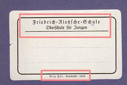 3 - Heftetikett mit dem aufgedruckten Schulnamen; die die Hefte liefernde Druckerei bzw. Papierhandlung befand sich in der Krausenstr. 24/25