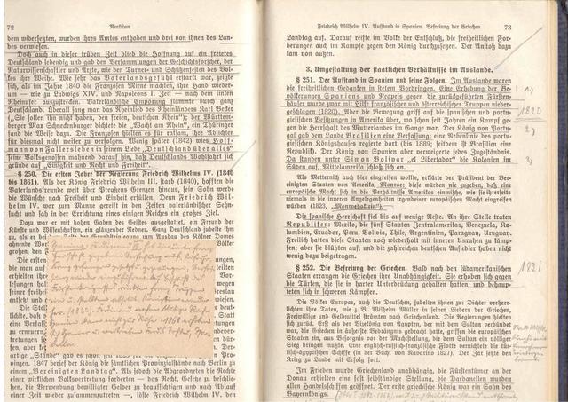 5 -Die Lehrbücher sind mit vielen Notizen des Schülers versehen; kleine Merkzettel sind eingelegt und mitunter befinden sich auch Zeitungsauschnitte in den Büchern (hier: Geschichte des deutschen Volkes von 1648 bis zur Gegenwart von Dr. H. Pinnow [Oberlehrer in Frankf. a.M.], 14. Aufl., Verlag und Druck von B.G. Teubner in Leipzig und Berlin, 1936)