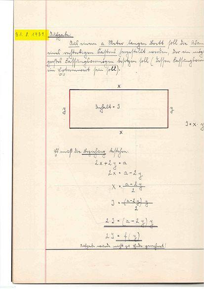 10 - Aus dem Mathematikheft der Klasse VIII (13. Jg.); diese Aufgabe schrieb der Schüler am Donnerstag, dem 31. August 1939, in sein Heft - der Schüler Helmut B. wird nicht geahnt haben, dass dies seine letzte Mitschrift in Mathematik zu Friedenszeiten gewesen ist, denn einige Stunden später beginnt etwas, was Jahre später als II. Weltkrieg bezeichnet wird; die nächste Mitschrift ist mit dem 12. September datiert - scheinbar fand im Zeitraum dazwischen kein Unterricht statt