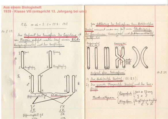 7 - Aus einem Biologiearbeitsheft von 1939; Chromosomen; Klasse VIII (entpsricht 13. Jg. bei uns) --> Diese Ausarbeitung wurde zwei Wochen vor Kriegsbeginn vom Schüler angefertigt!