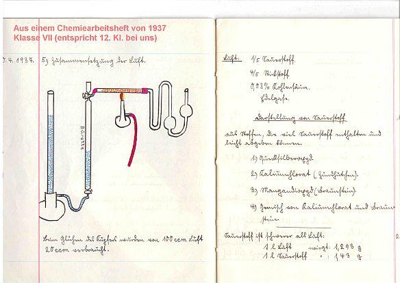 6 - Aus einem Chemiearbeitsheft von 1937; Zusammensetzung der Luft; Klasse VII (entspricht dem 12. Jg. bei uns)