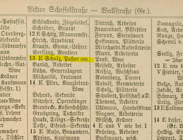 Pastor Schulz ist im halleschen Adressbuch von 1904 in der Viktor-Scheffel-Str. 13 als Eigentümer des Hauses gemeldet (s. Foto 2).
