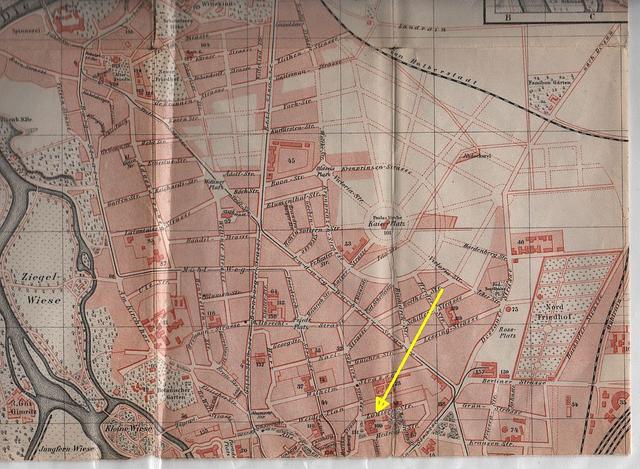 Darunter befindet sich der "Führer durch Halle a. S. und seine staatlichen und städtischen Einrichtungen und Anstalten" aus dem Jahre 1900, der vom Stadtbaurat Genzmer erstellt wurde. Dazu gehört auch ein Stadtplan ("Plan der Stadt Halle a/S, neu aufgenommen und gezeichnet vom Stadtbauamt"), der die Bausituation unseres Schulkomplexes gut zum Ausdruck bringt (s. Fotos 1 - 2).