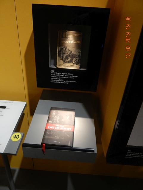 Am 13. März 2019, dem 100. Todestag von Karl Meseberg, lud das Stadtmuseum zu einer Gesprächsrunde über Meseberg ein, der während der Novemberrevolution in Halle eine bedeutende Rolle spielte. Norbert Böhnke vom Stadtmuseum moderierte die Veranstaltung. Eingeladen waren neben Dr. Werner Neuß auch wir, da wir auf den Spurensuchenseiten mehrmals auf den ehemaligen Abiturienten des Stadtgymnasiums, Felix Huberti alias Felix Kersten, verwiesen und ausführliche Recherchen zu Ernst Ottwalt alias Ernst Gottwalt Nicolas durchgeführt hatten. Herr Böhnke betonte bei einem kurzen Rundgang durch ausgewählte Abteilungen des Museums, dass auch das Stadtmuseum den Roman Ernst Ottwalts "Ruhe und Ordnung" ausgestellt habe (s. Foto 2).